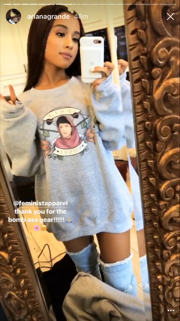It’s hard to tell, but the shirt has an image of Malala Yousafzai and appears to say “fight like a girl.”